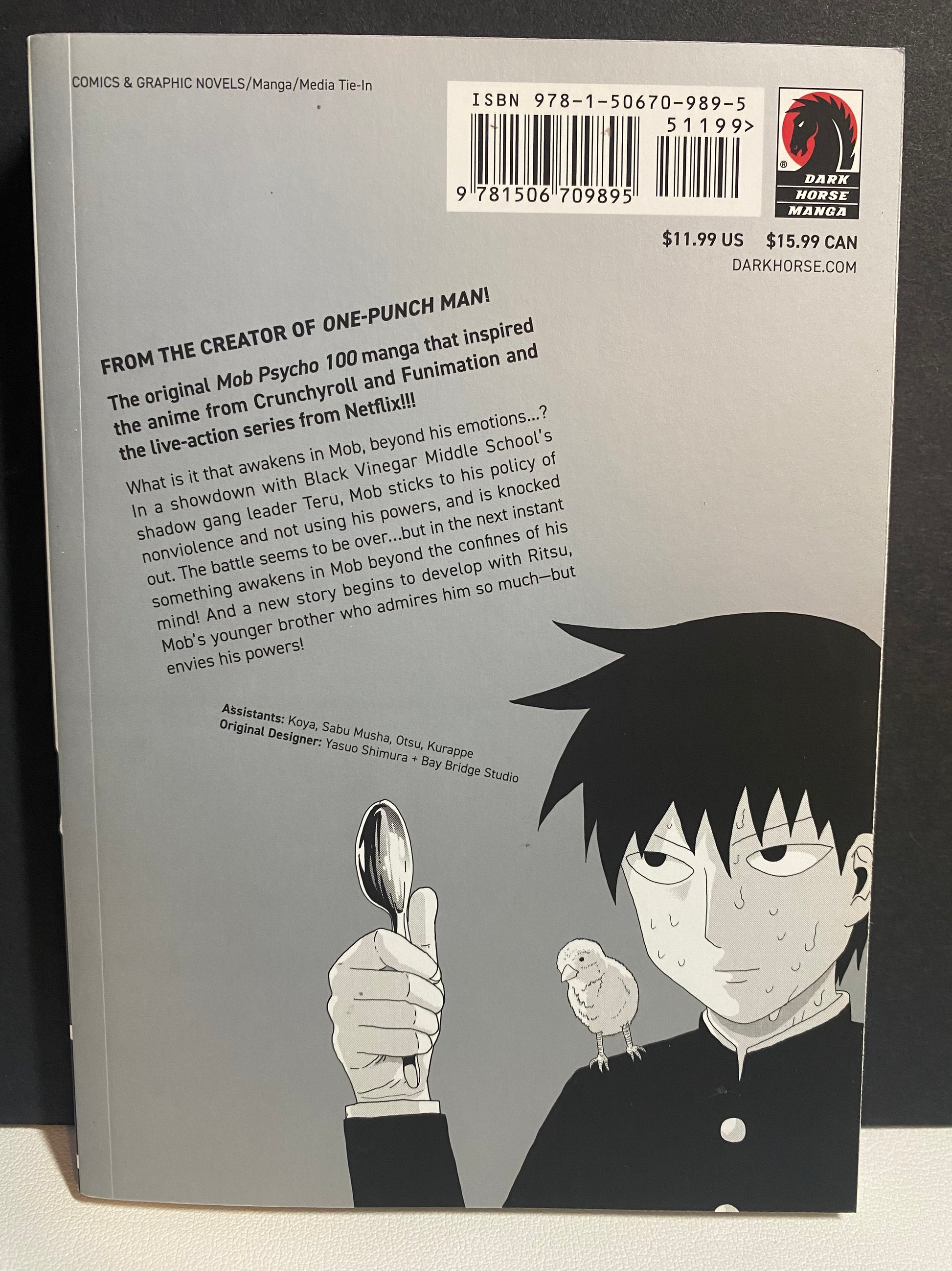 In a showdown with Black Vinegar Middle Schools shadow gang leader, Teru, Mob sticks to his policy of nonviolence and refrains from using his powers--and gets knocked out! The fight seems over for Mob . . . but something then awakens in Mob, beyond the confines of his conscious mind! And in the aftermath, a new story develops with Ritsu, Mob's conflicted younger brother who enjoys the social success Mob desires . . . yet still longs for what Mob has that Ritsu lacks--psychic power!